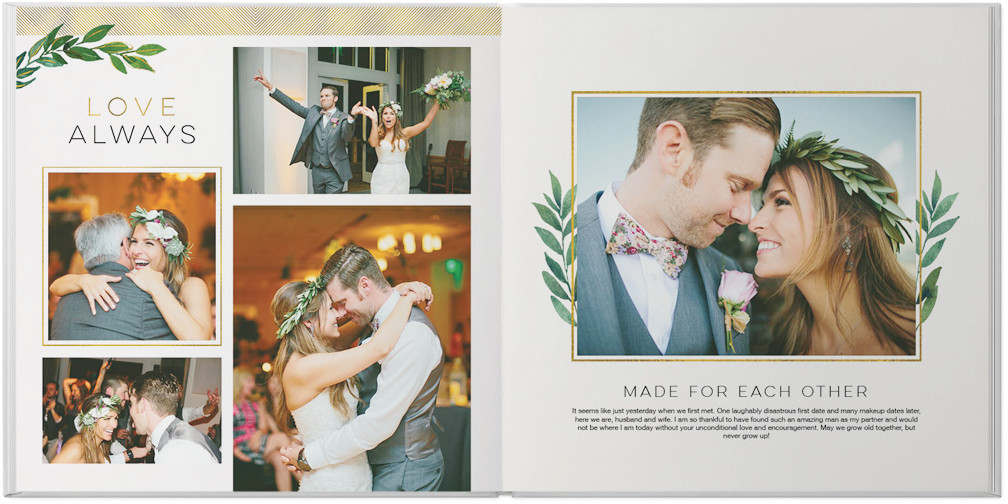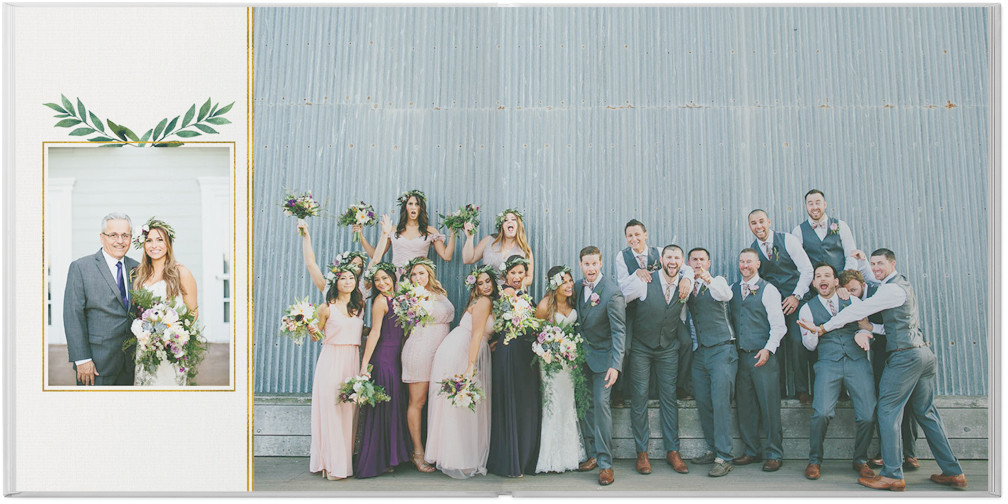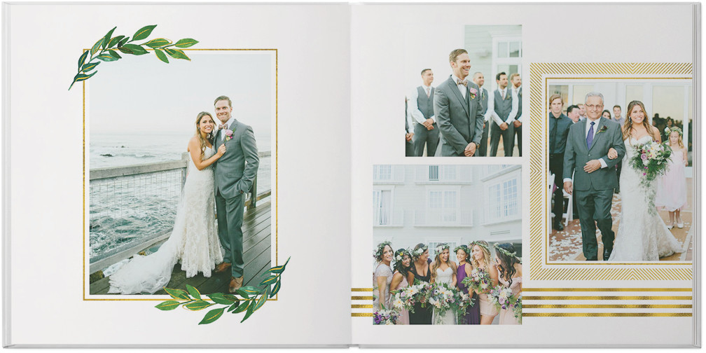 From that first look to the last dance, when it comes to your big day, let no detail go uncaptured. Hold on to the magic of it all with this elegant custom photo book. Stylishly simplistic layouts paired with enchanting touches of gold and foliage bring your memories into focus. Endless possibilities - all layouts, embellishments, text and elements are fully customizable.