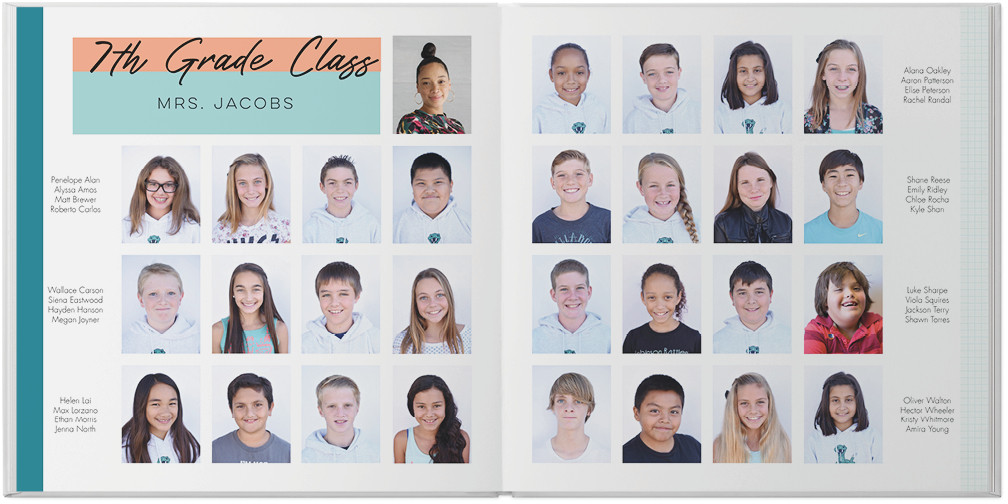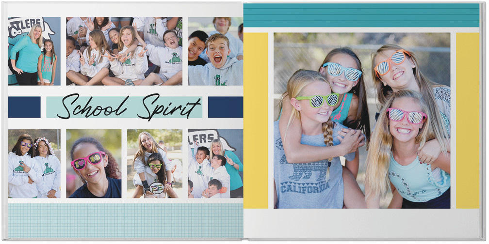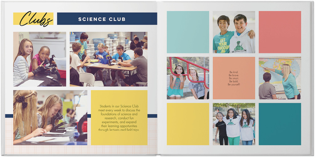 Create a yearbook to capture the most memorable moments of the school year. Classic color blocking and gridded pages make this style perfect for elementary, middle, or high school. Highlight the unique memories of the year with special pages for sports, clubs, and of course student, classroom and faculty photos. Endless possibilities - all layouts, embellishments, text and elements are fully customizable.