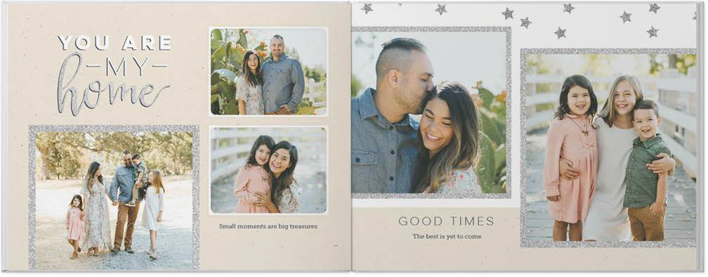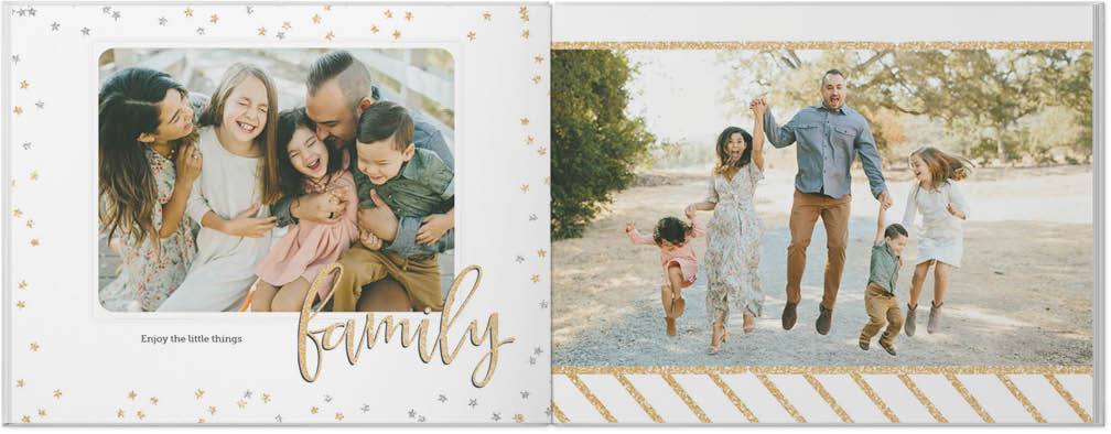 Make everyday moments sparkle with this custom photo book. Cheerful polka dots and sweet stripes in faux gold and silver add shimmer and shine to every photo. Playfully chic brush script embellishments against neutral backgrounds give each page a sweet, whimsical glow. Endless possibilities - all layouts, embellishments, text and elements are fully customizable.