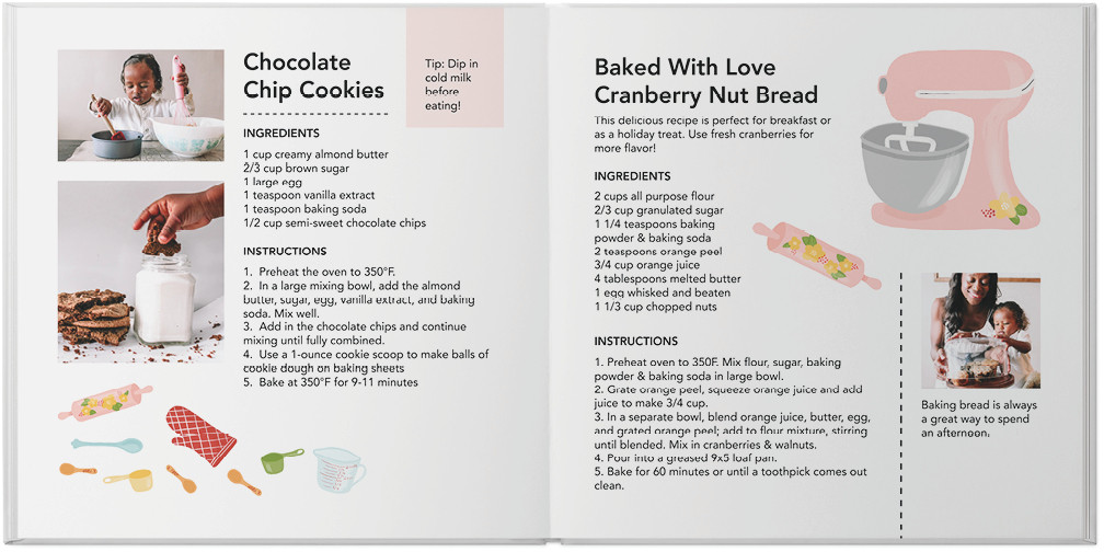 Get cooking with this fun recipe style! Whimsical hand-painted embellishments and type will make all your favorite recipes - from savory appetizers to delicious desserts - come to life. Perfect as a keepsake in your own kitchen or for gifting to friends and family. Endless possibilities - all layouts, embellishments, text and elements are fully customizable.