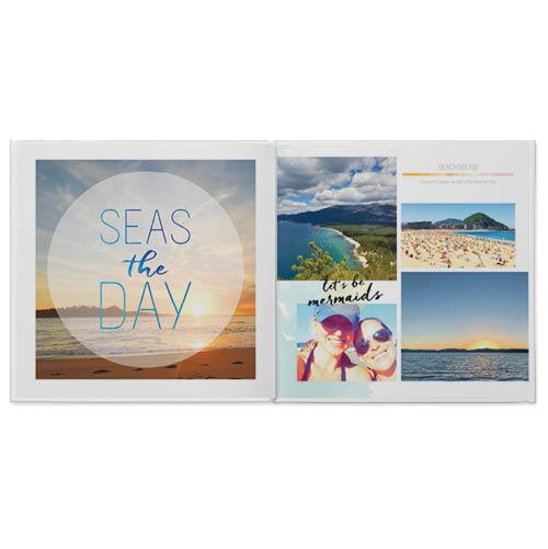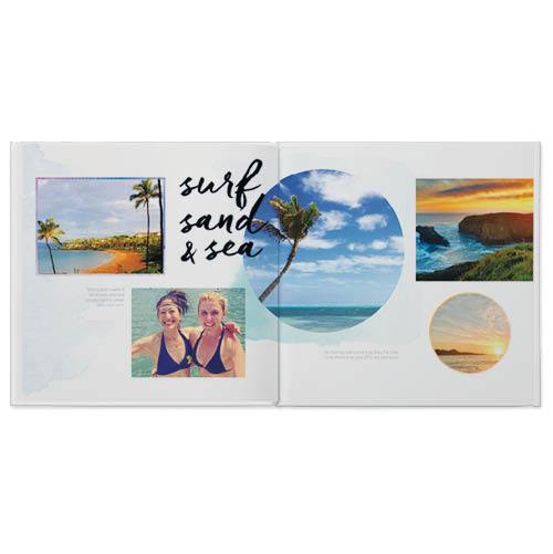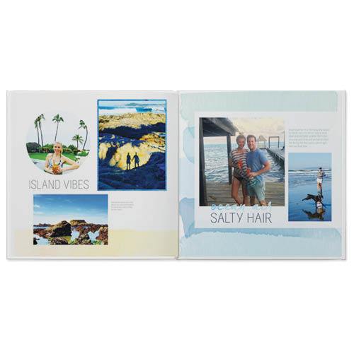 Return to paradise with this fresh and modern photo book. Whimsical watercolor splashes and colorful ombre frames in warm hues create an ideal setting for all those toes-in-the-sand moments. Play around with geometric photo shapes and overlays to make your scenic shots and your selfies pop, then add a fun twist with beach-inspired sentiments and subtle keyline embellishments. This premium style was designed by Yours Truly.