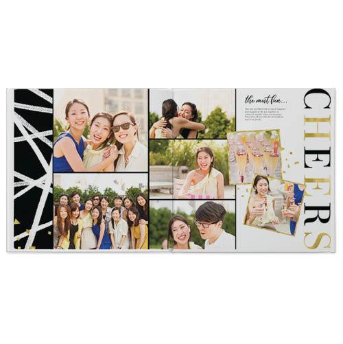 This festive photo book style will complement any occasion! Build the perfect book with hand drawn, high contrast backgrounds, faux foil, and type embellishments for a wide range of celebrations. Playful burst designs and clusters of faux glitter pair with traditional layouts for easy photo placement. Cheers! This premium style was designed by Float Paperie.