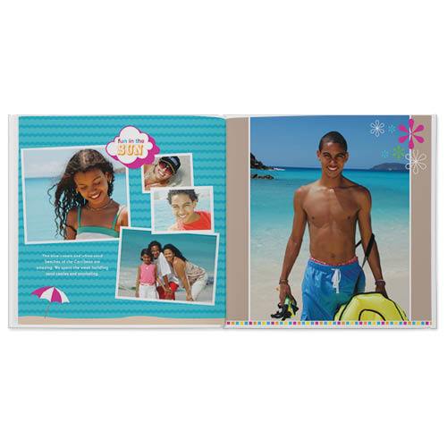 Make a splash with colorful starfish, seashells and seahorses in this beach vacation style photo book. Fill it with waves, palm trees, tropical drinks and everything under the sun. Designed by Yours Truly.