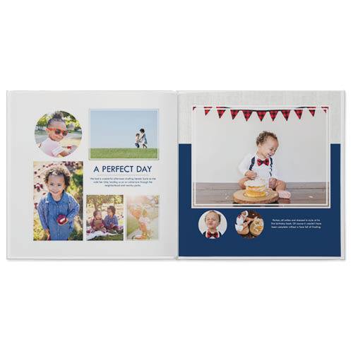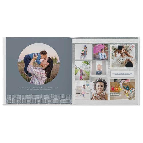 Time flies when you're having fun. Remember your together-the amazing adventures had, the challenges, the silly stuff-with this modern, versatile design. Neutral tones and soft-textured blues add just the right amount of warmth to those heartwarming everyday moments, while linear frames and hand-stitched borders give prominence to little details. This style was designed by Yours Truly.